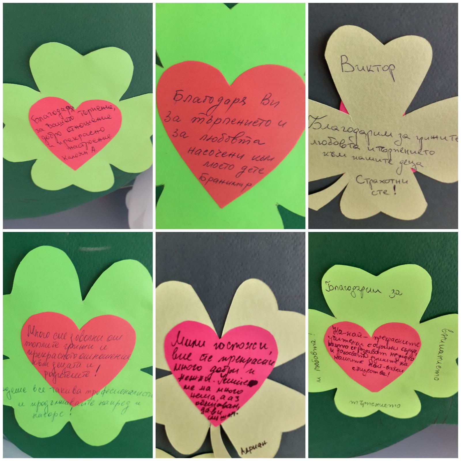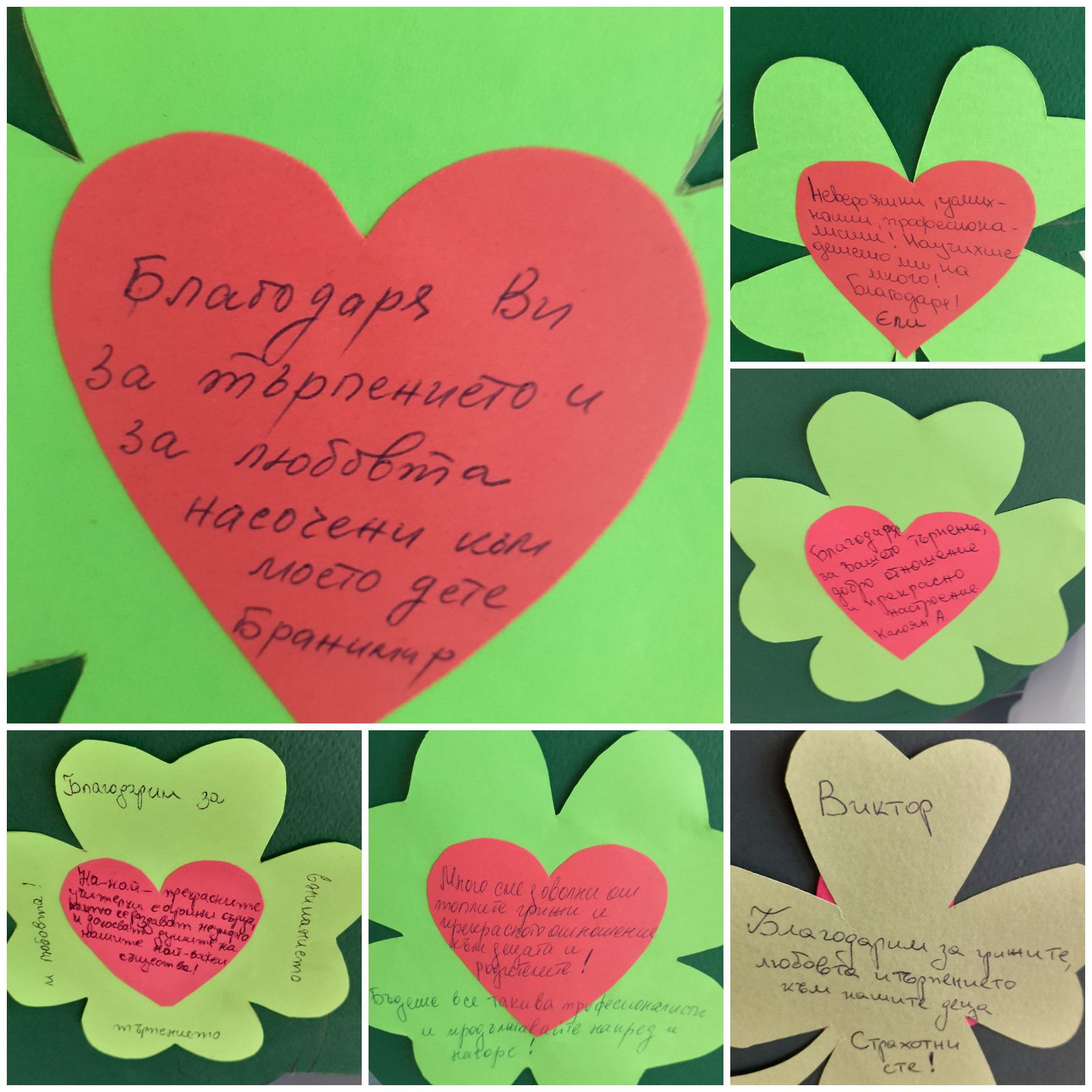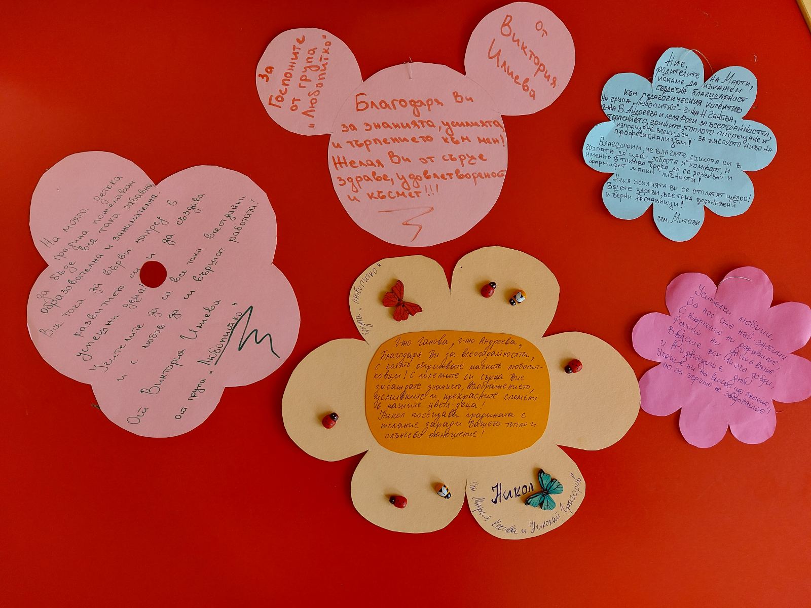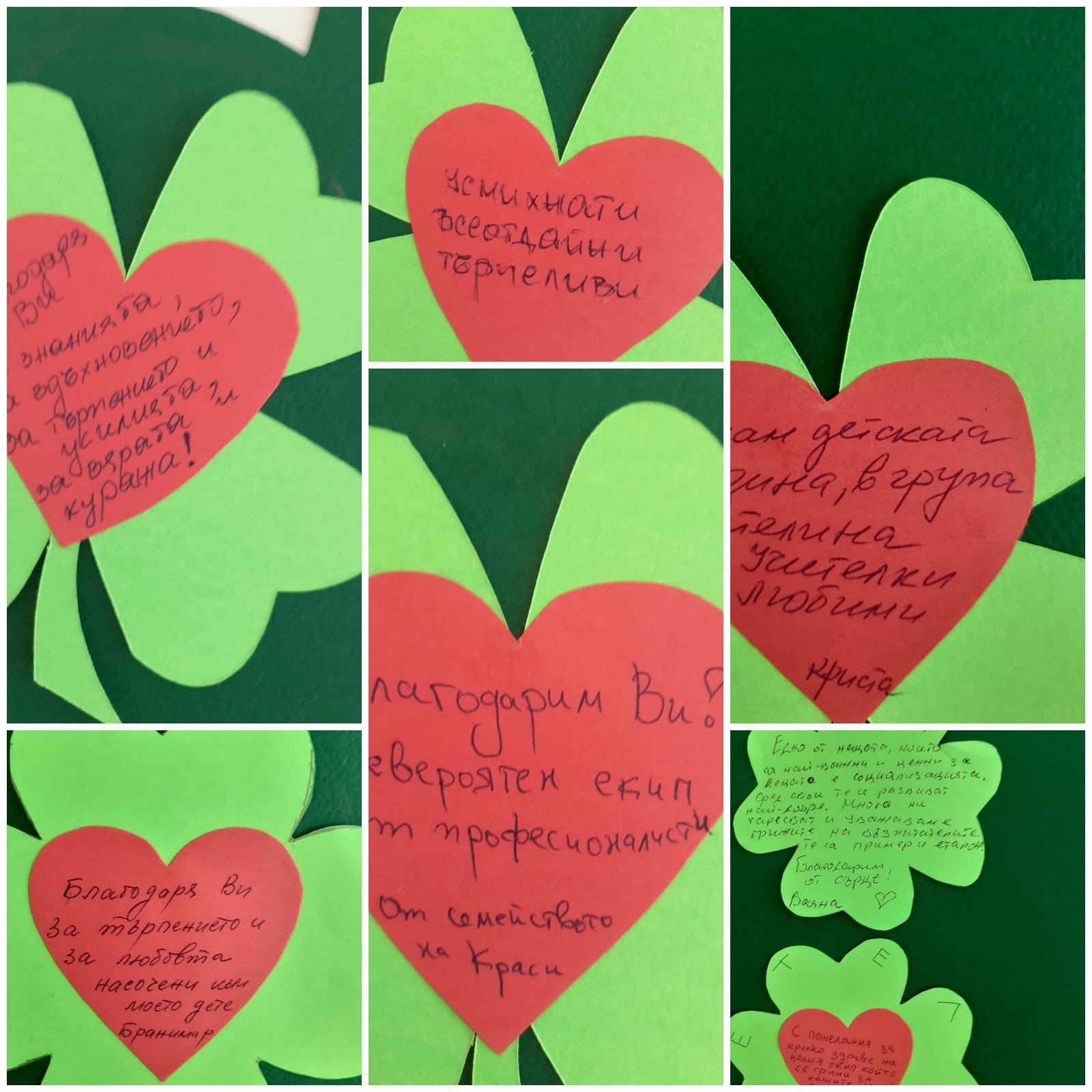 На красиво оформените творения могат да се прочетат сърдечни думи на благодарност и прекрасни пожелания. Родителите изказват многократно специални благодарности и на директора на ДГ№90 „Веса Паспалеева“- г-жа Катя Йорданова, за винаги топлото отношение към тях и техните деца, за отзивчивостта й и бързото решаване на всеки възникнал казус.