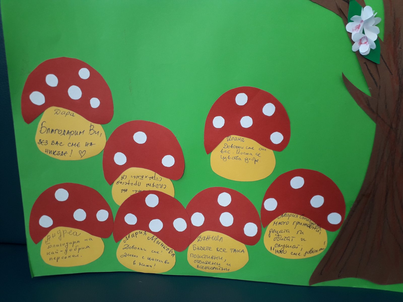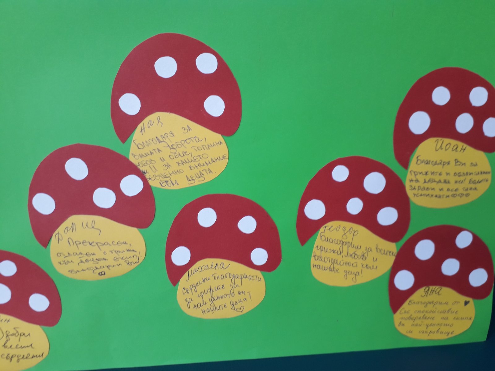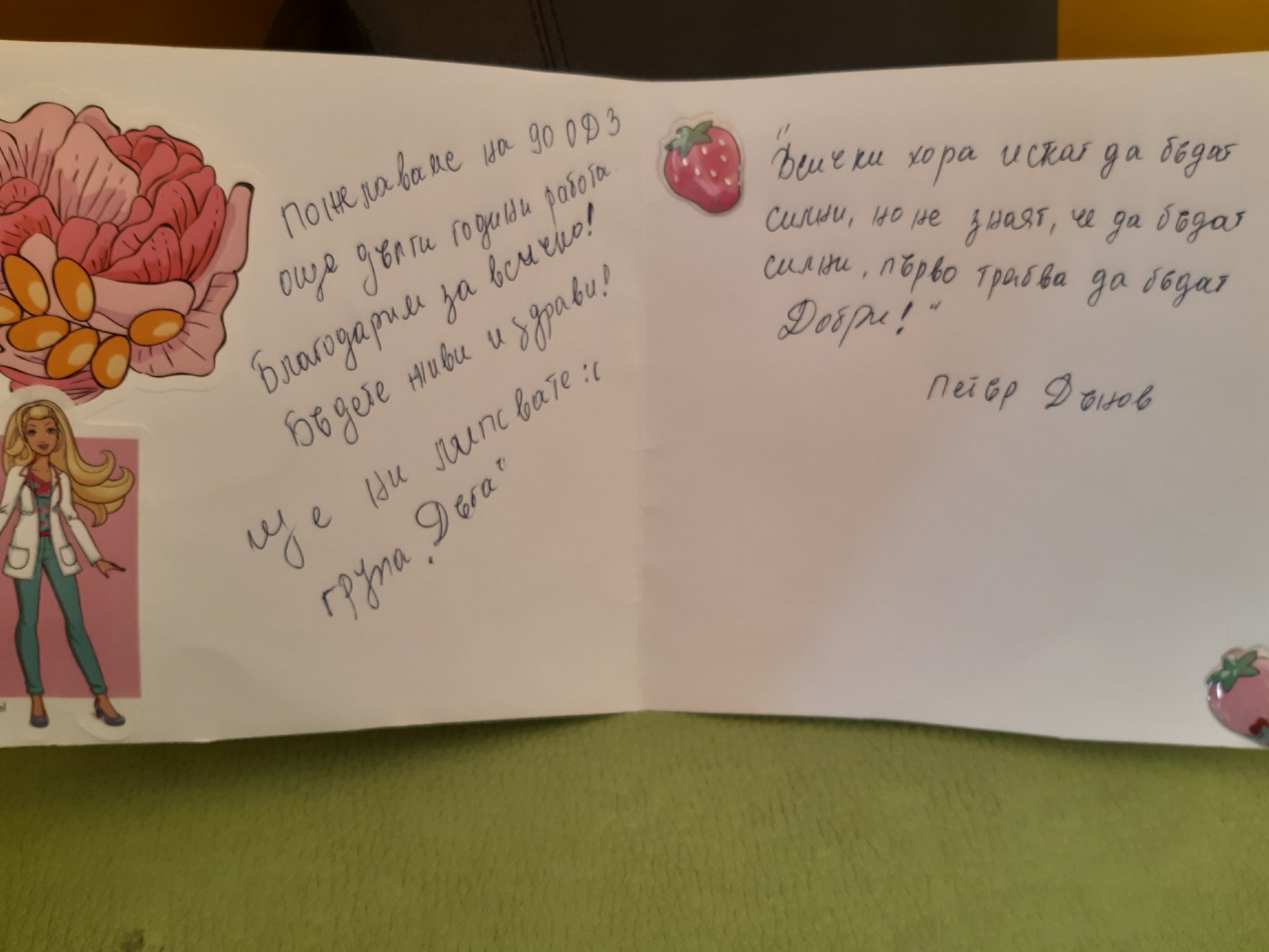 Скъпи родители, екипът на ДГ№90 „Веса Паспалеева“ ви благодари от сърце за отзивчивостта и доверието към нас! Благодарим за добрите ви думи! Благодрим ви, че превърнахте един обикновен ден, в необикновен празник на добротата! Убедени сме, че с общите ни усилия ДГ№90 ще продължи да бъде най-доброто място, в което да растат децата ни щастливи и заобиколени от внимание и обич!“