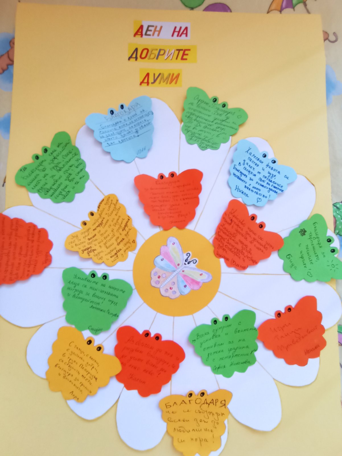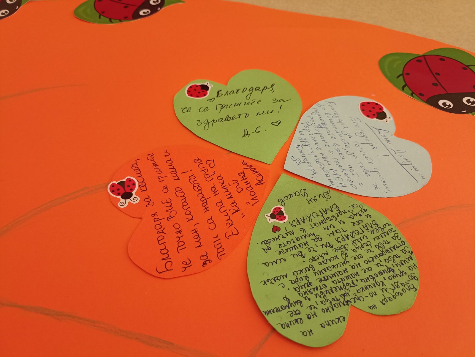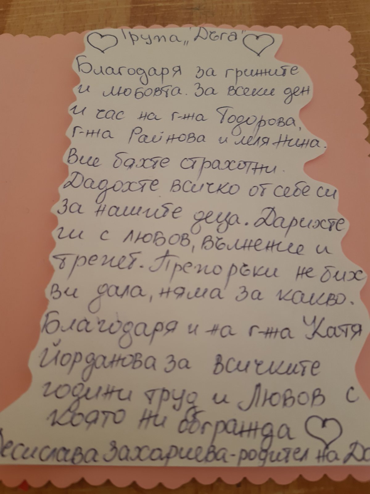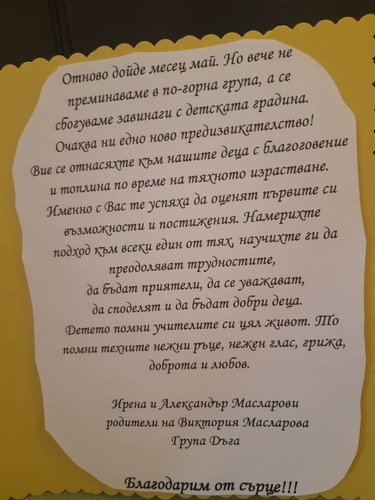 Скъпи родители, екипът на ДГ№90 „Веса Паспалеева“ ви благодари от сърце за отзивчивостта и доверието към нас! Благодарим за добрите ви думи! Благодрим ви, че превърнахте един обикновен ден, в необикновен празник на добротата! Убедени сме, че с общите ни усилия ДГ№90 ще продължи да бъде най-доброто място, в което да растат децата ни щастливи и заобиколени от внимание и обич!“