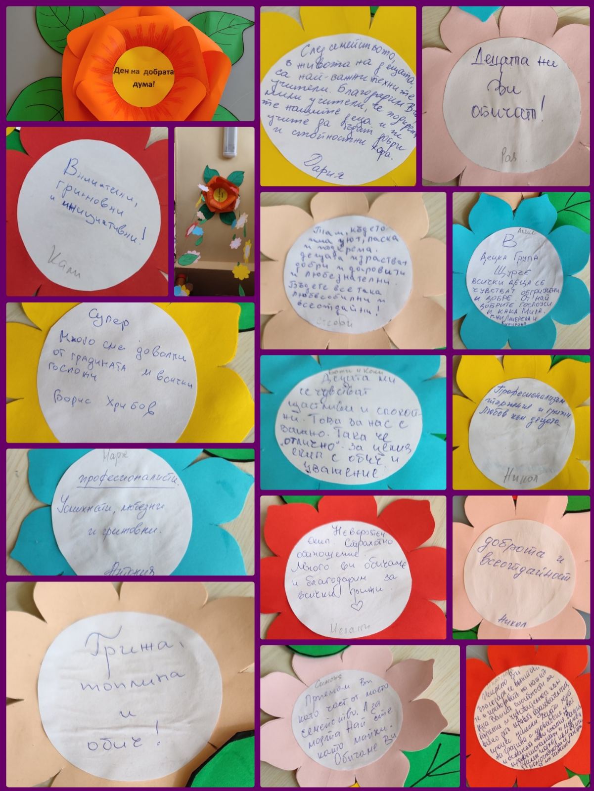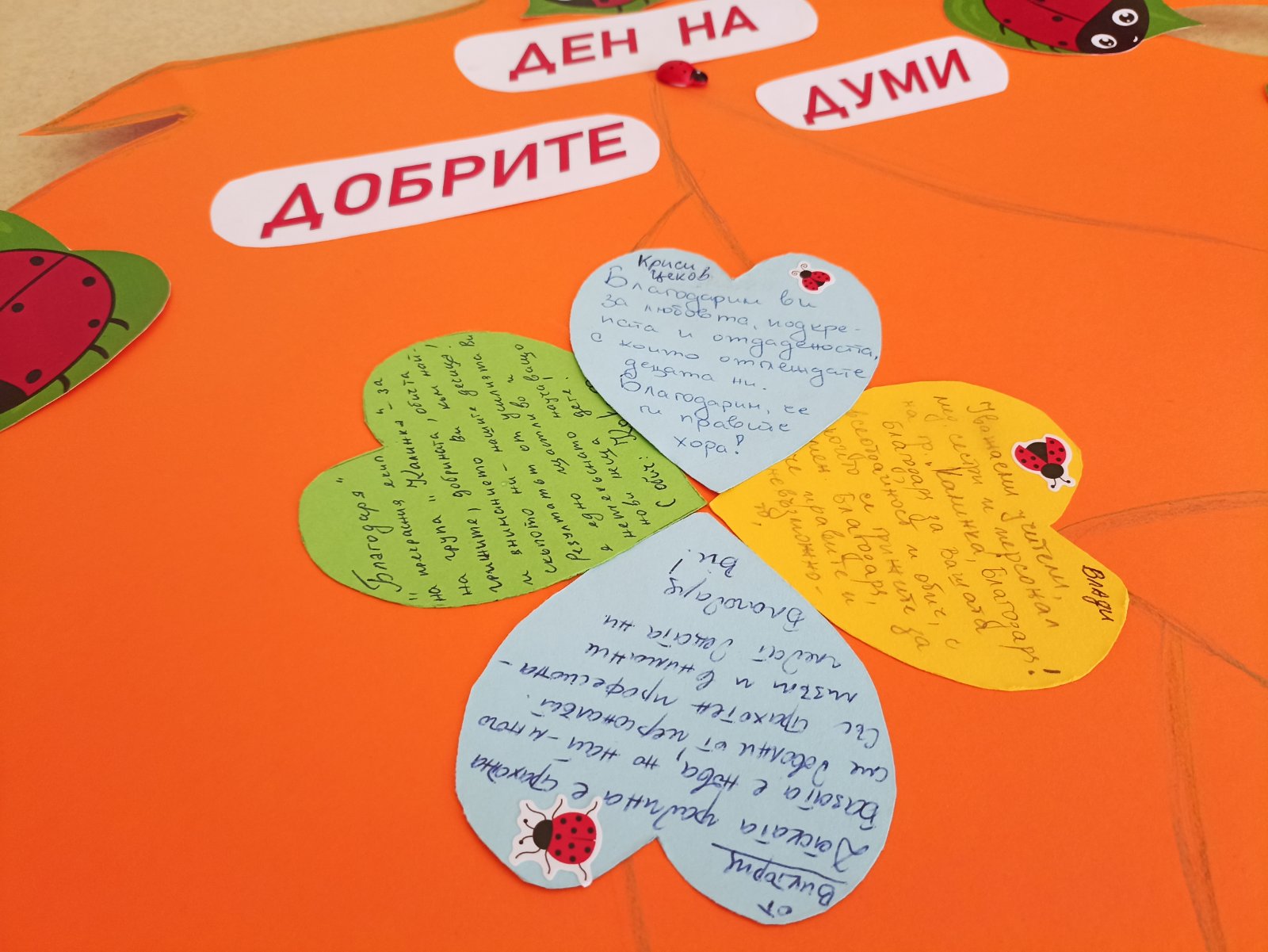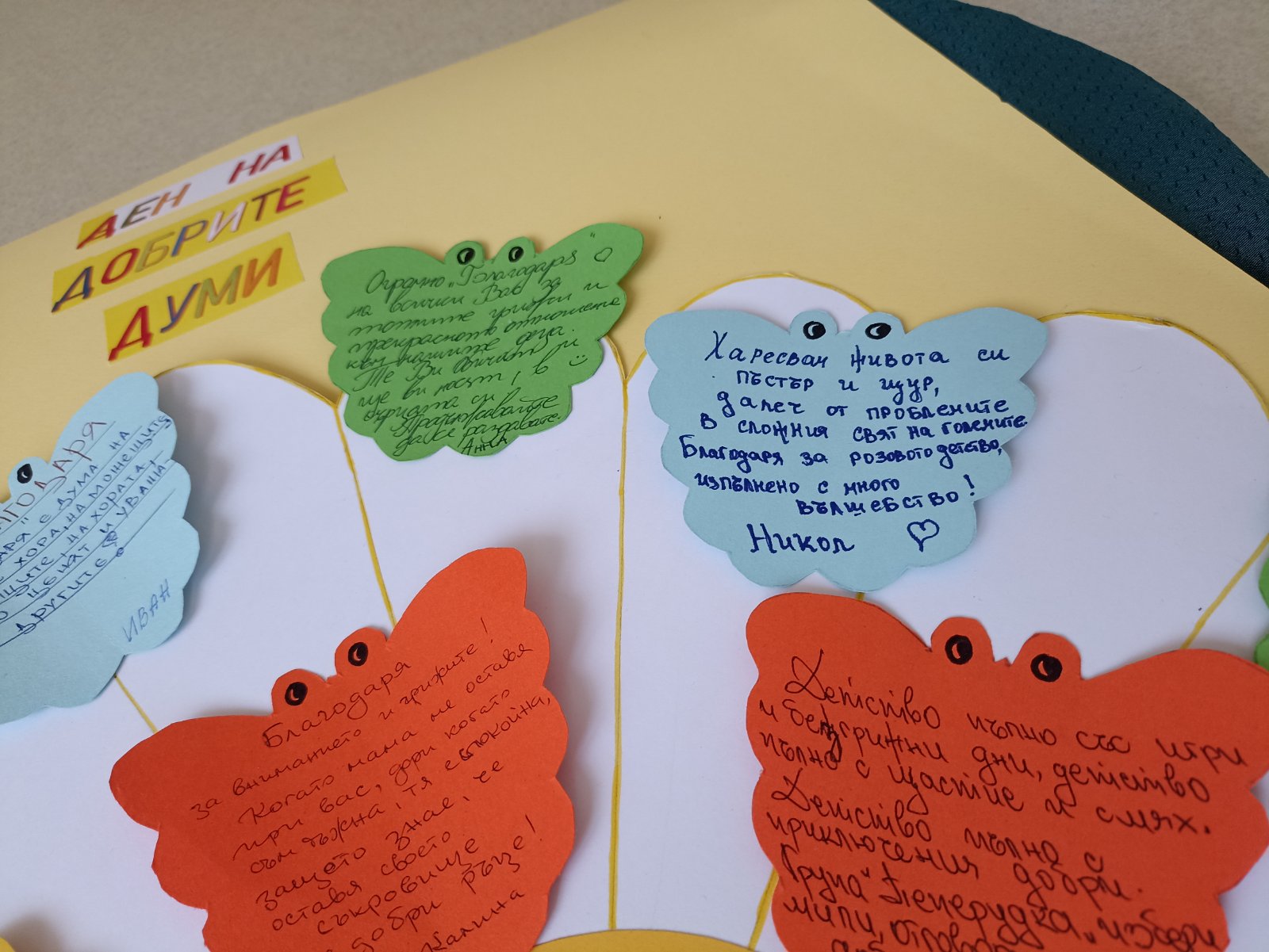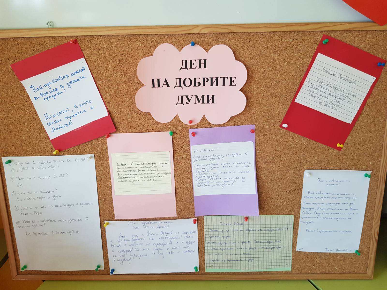 22 март 2022г. беше обявен за „Ден на добрите думи“ в ДГ№90, след предложение на г-жа Силвия Тончева –майка на Божидар от гр. „Бонбон“, да се даде възможност на родителите да споделят хубавото, доброто, което мислят и чувстват към персонала на детското заведение.