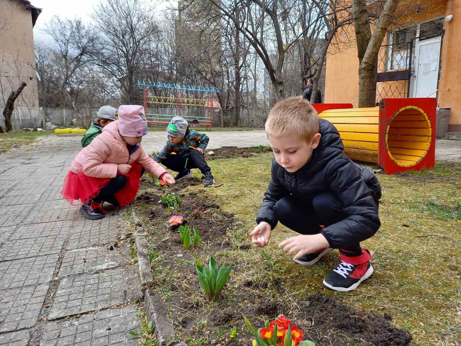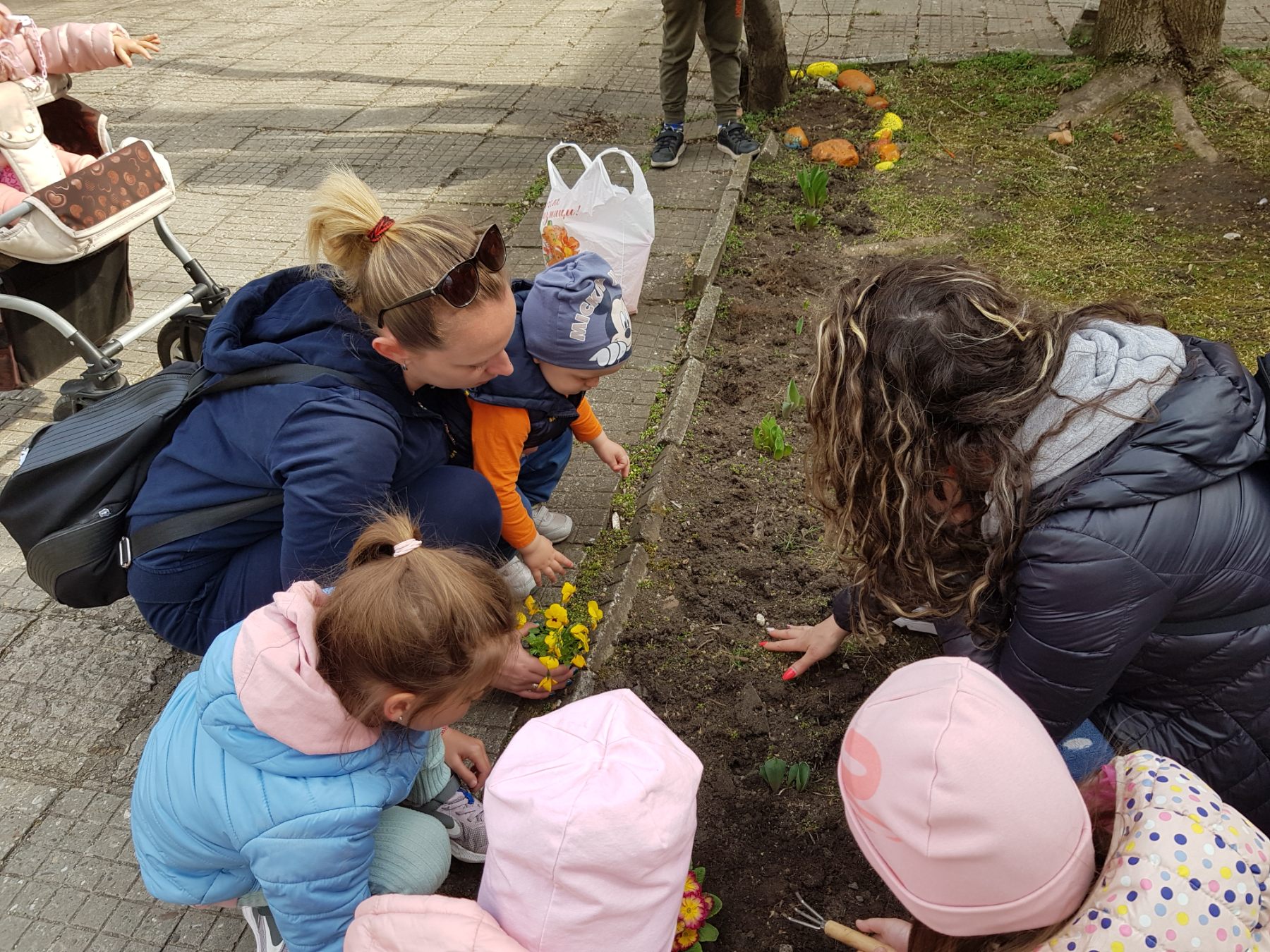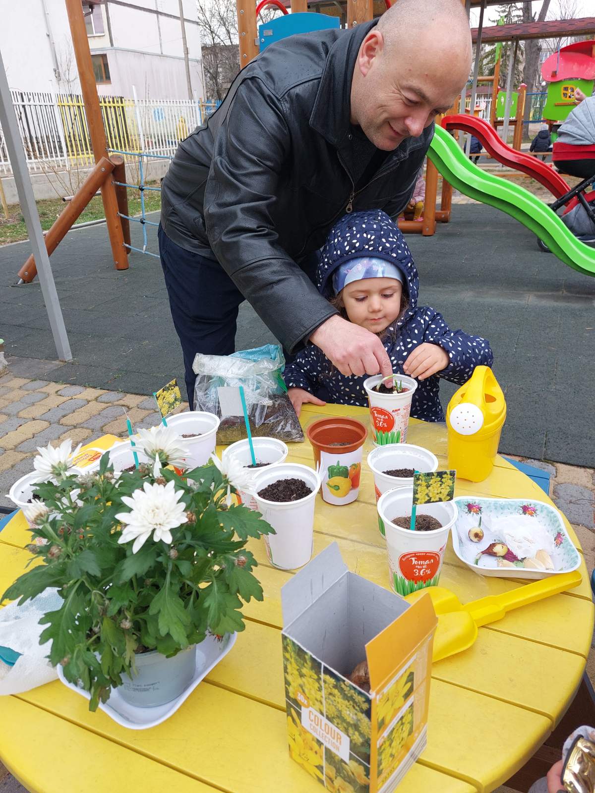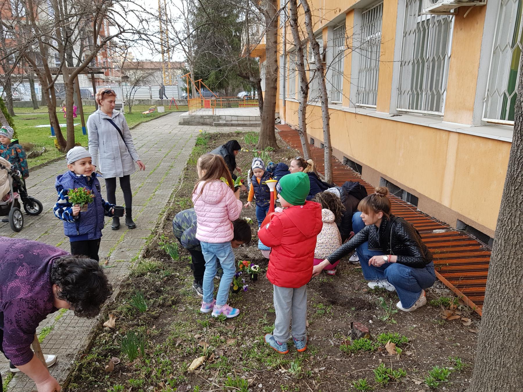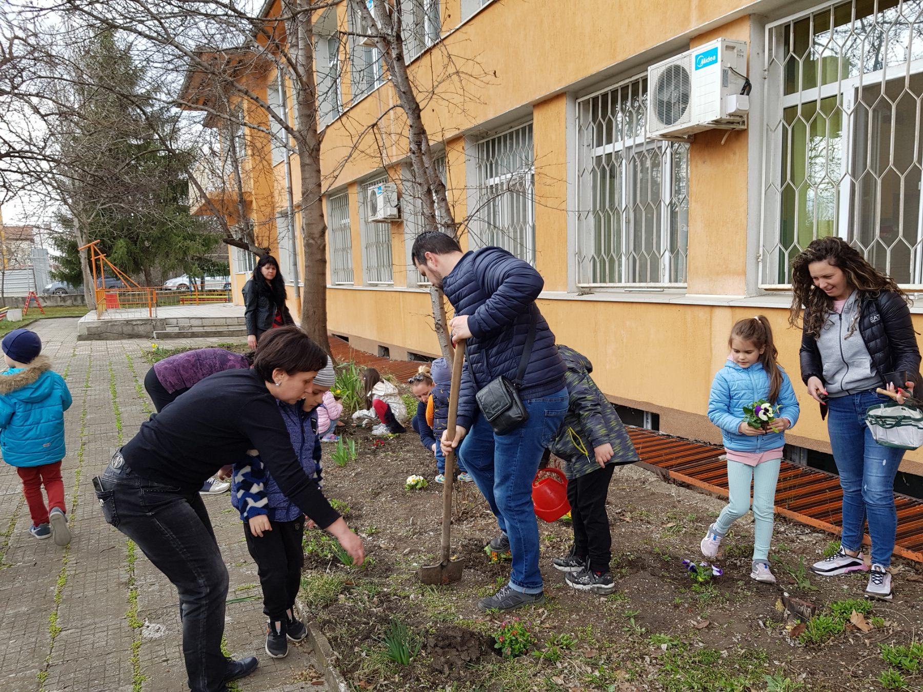 Родителите от градинските групи „Детелина“, „Щурче“ , „Бонбон“ и яслена група „Гъбка“ от филиал „Бял люляк“,  използваха топлия и слънчев пролетен ден, за да засадят в двора на детската градина цветя и растения, които да радват всички с пъстротата и красотата си.