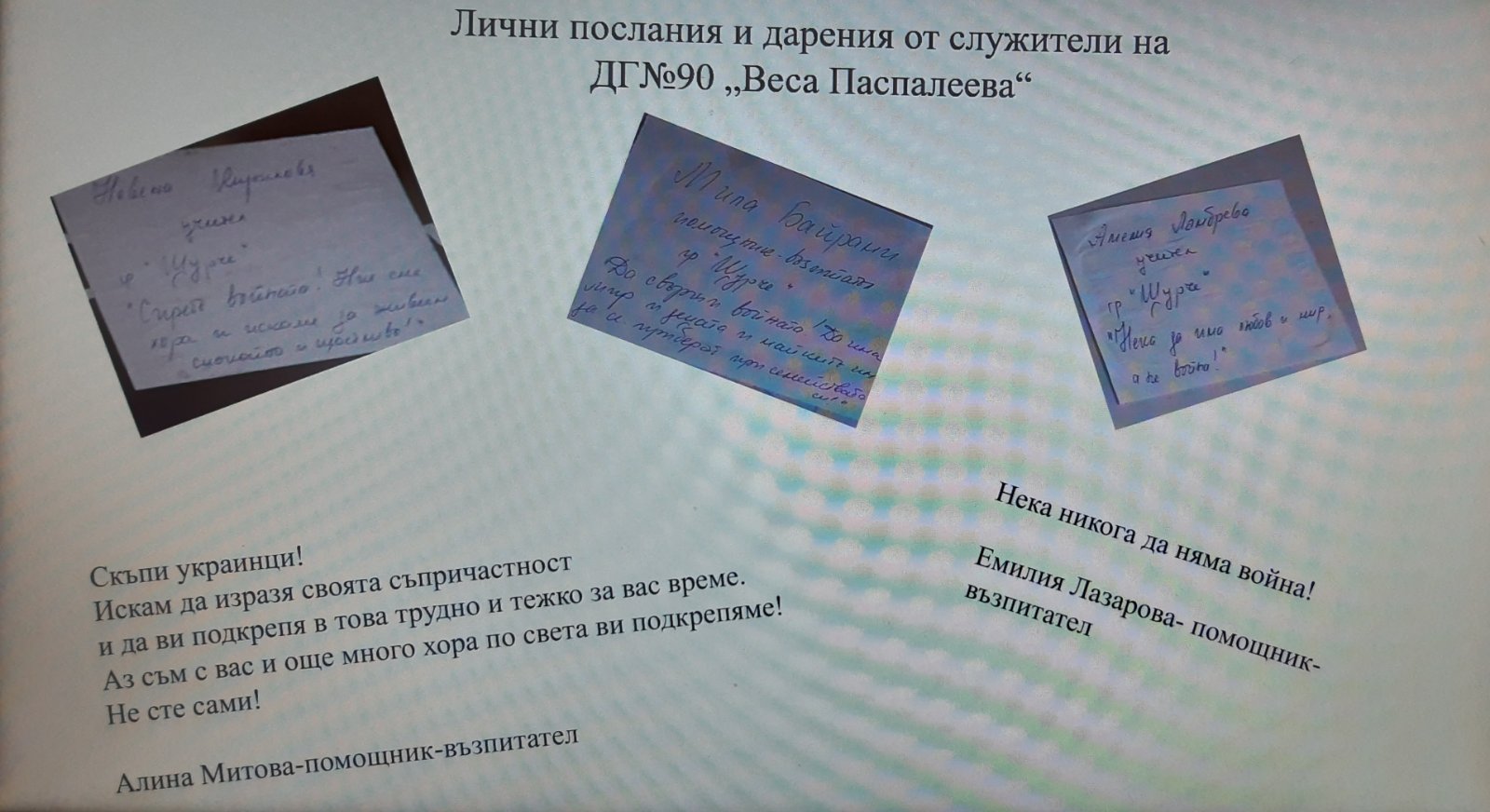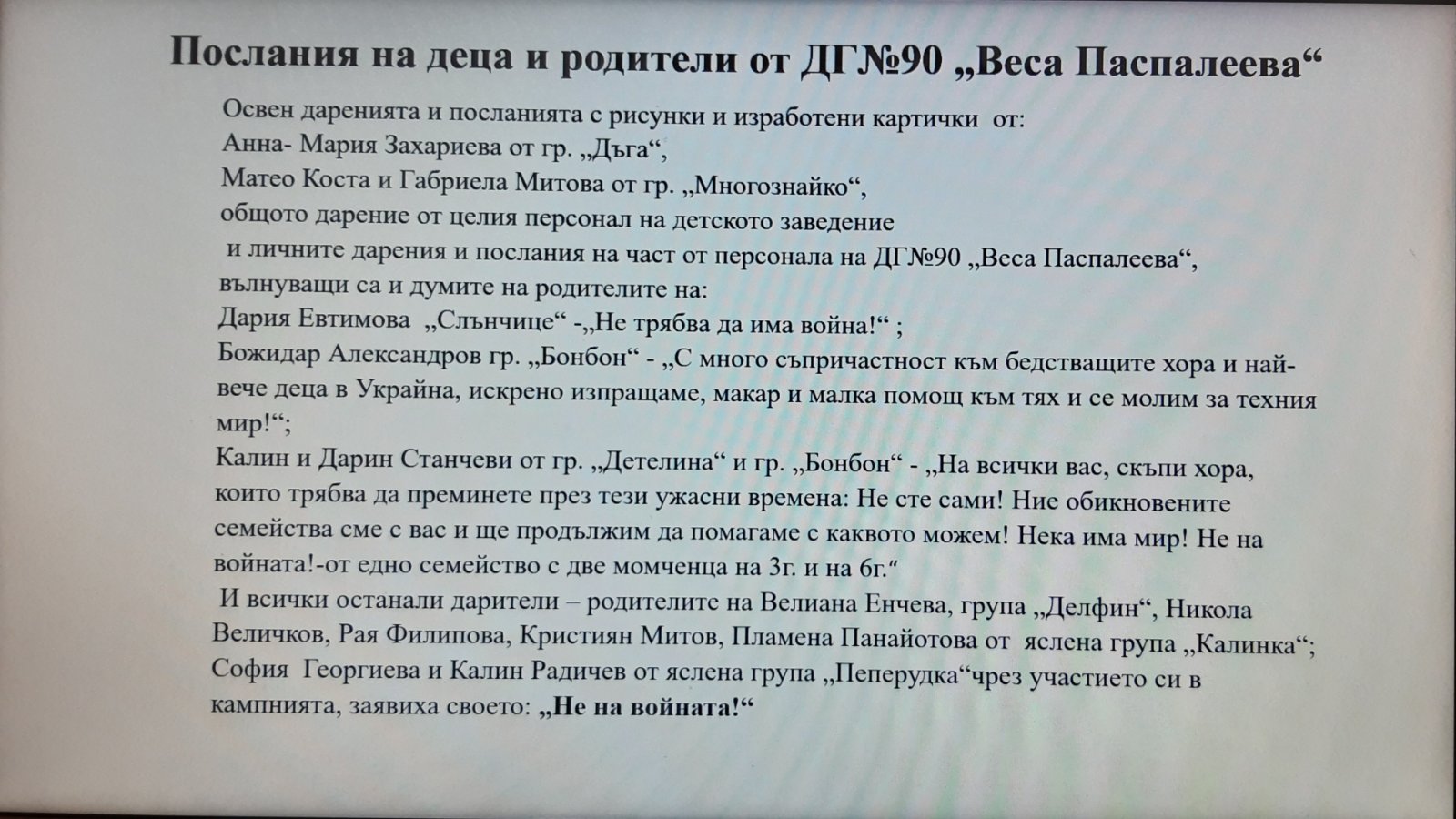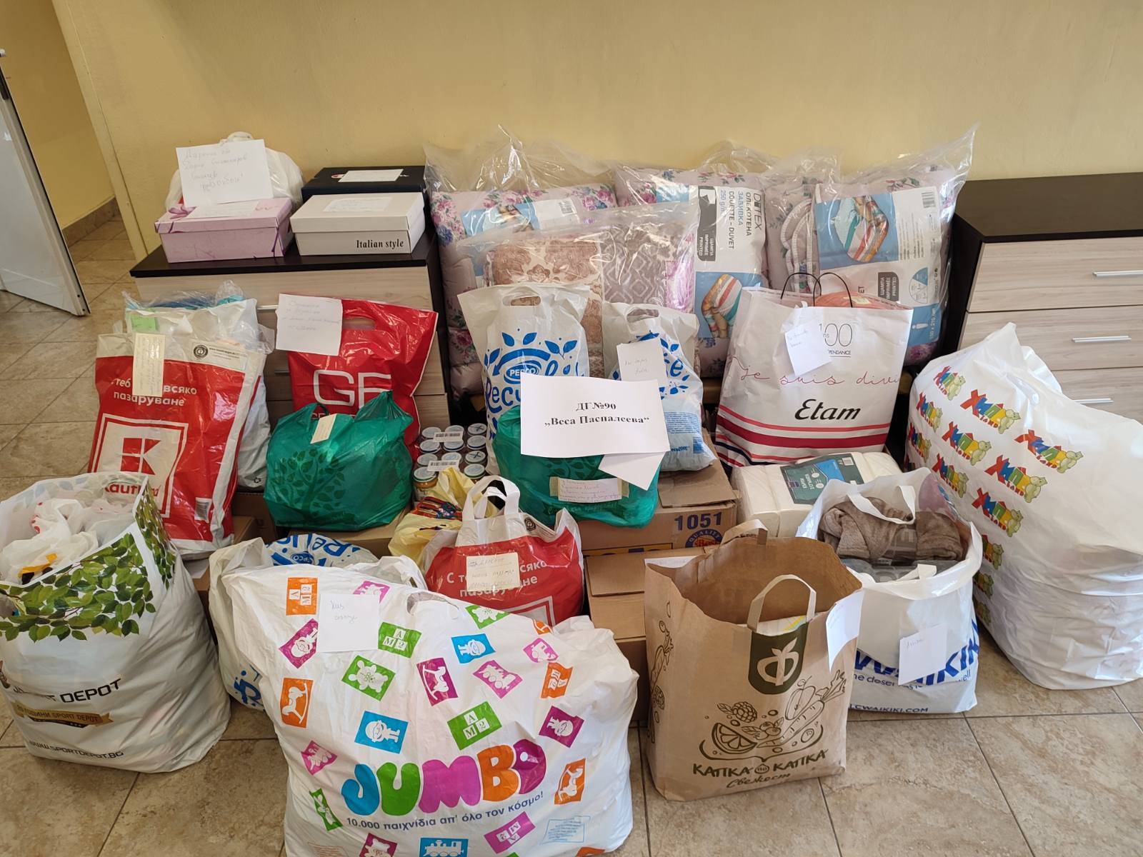 Кампанията на район „Надежда“ – „Mисия Надежда“ в подкрепа на Украйна, докосна семействата и персонала на ДГ№90 „Веса Паспалеева“. За няколко дни бяха събрани дарения, подготвени от родителите на деца от всички групи на детската градина, персонала и граждани от квартала. Пакетите, освен грижливо подготвени, са придружени от искрени и емоционални послания, изразяващи съпричастност, съчувствие и подкрепа в трудния път, който се налага да поемат милиони човешки съдби – украински майки с децата си и възрастни хора, търсещи спасение от ужаса на войната.