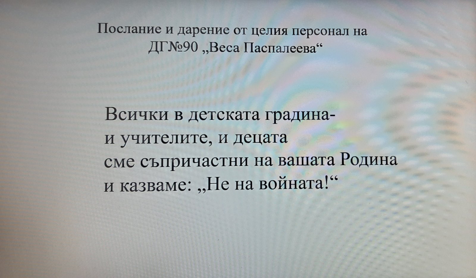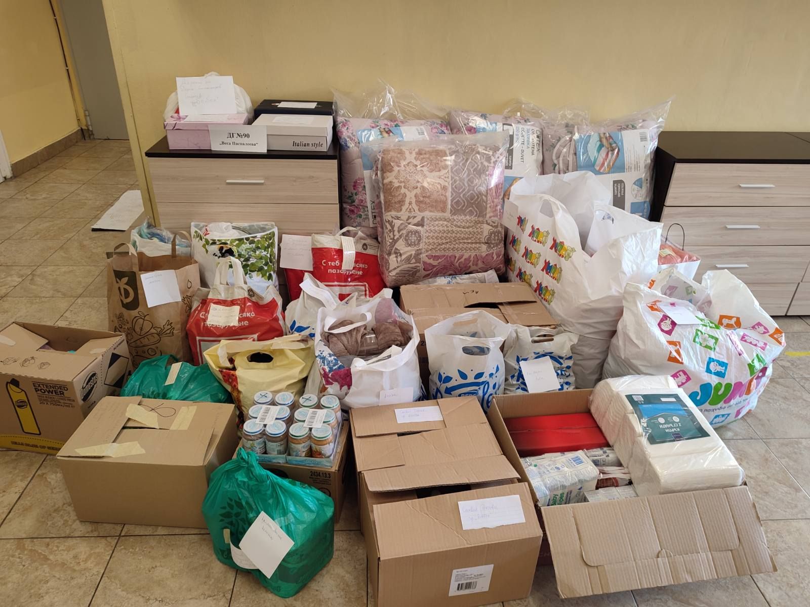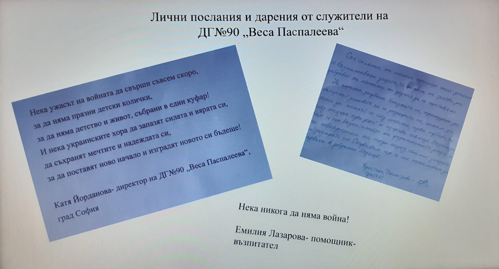 Кампанията на район „Надежда“ – „Mисия Надежда“ в подкрепа на Украйна, докосна семействата и персонала на ДГ№90 „Веса Паспалеева“. За няколко дни бяха събрани дарения, подготвени от родителите на деца от всички групи на детската градина, персонала и граждани от квартала. Пакетите, освен грижливо подготвени, са придружени от искрени и емоционални послания, изразяващи съпричастност, съчувствие и подкрепа в трудния път, който се налага да поемат милиони човешки съдби – украински майки с децата си и възрастни хора, търсещи спасение от ужаса на войната.
